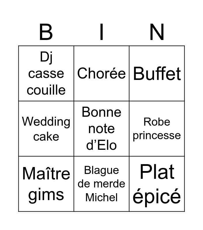 This bingo card has 9 words: Maître gims, Buffet, Chorée, Wedding cake, Dj casse couille, Robe princesse, Bonne note d’Elo, Plat épicé and Blague de merde Michel.