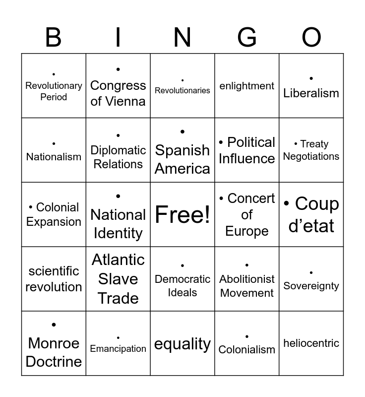 This bingo card has a free space and 24 words: Atlantic Slave Trade, • Emancipation, • Spanish America, • Monroe Doctrine, • Liberalism, • Revolutionary Period, • Nationalism, • Congress of Vienna, • Concert of Europe, • Democratic Ideals, • Political Influence, • Colonial Expansion, • Abolitionist Movement, • Sovereignty, • Diplomatic Relations, • Colonialism, • Coup d’etat, • Revolutionaries, • Treaty Negotiations, • National Identity, heliocentric, scientific revolution, enlightment and equality.