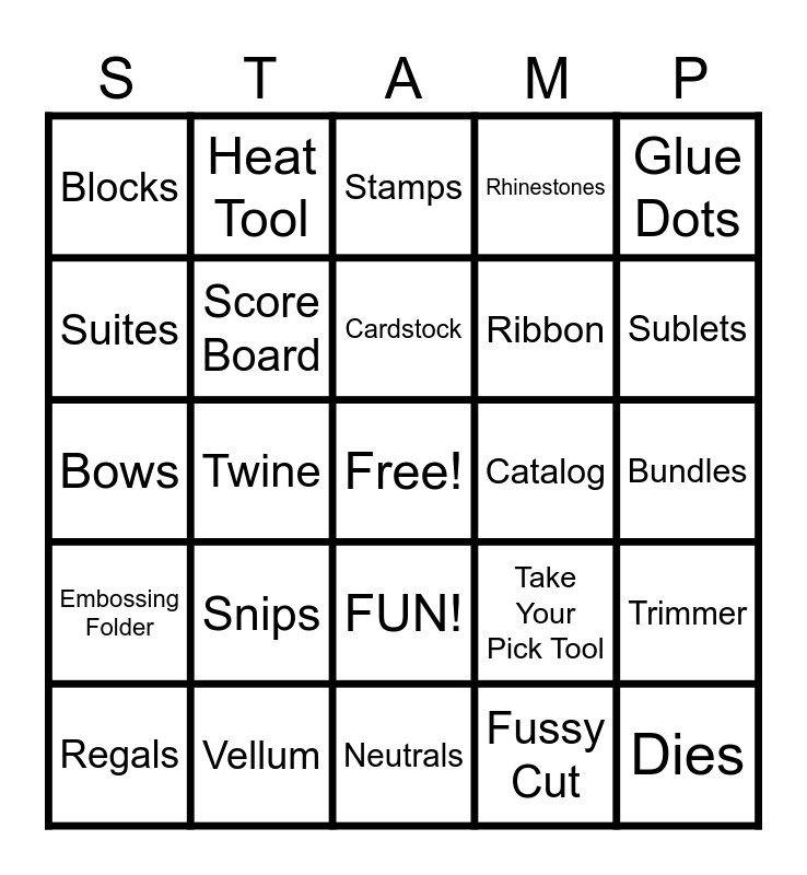 This bingo card has a free space and 38 words: Ink Pad, Refill, Bone Folder, Score Board, Trimmer, Snips, Cardstock, DSP, Glue Dots, Ribbon, Twine, Rhinestones, Dies, Bundles, Suites, Embossing Folder, Blends, Stamps, Tombow, Catalog, Blocks, Vellum, Sublets, Regals, Brights, Neutrals, Kits, Punches, In Colors, Markers, Creative, FUN!, Fussy Cut, Heat Tool, Tear Tape, Take Your Pick Tool, Bows and Grid Paper.