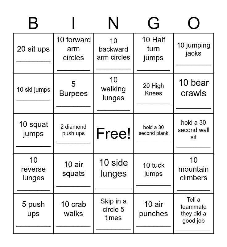 This bingo card has a free space and 24 words: 5 push ups ________, 10 air squats ________, 10 walking lunges ________, 10 air punches ________, 10 jumping jacks _________, 20 sit ups ________, 10 forward arm circles ________, 10 backward arm circles _________, hold a 30 second plank ____________, hold a 30 second wall sit __________, 10 squat jumps ________, 5 Burpees ________, 10 tuck jumps _________, 10 mountain climbers ________, 10 ski jumps __________, 10 crab walks ________, Skip in a circle 5 times _________, 10 Half turn jumps ________, 10 bear crawls _______, 10 reverse lunges ________, 2 diamond push ups ___________, 10 side lunges _______, 20 High Knees __________ and Tell a teammate they did a good job __________.