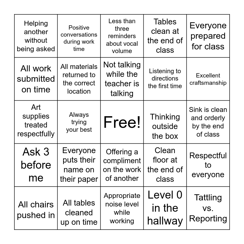 This bingo card has a free space and 24 words: Everyone puts their name on their paper, All tables cleaned up on time, Not talking while the teacher is talking, All chairs pushed in, Everyone prepared for class, Helping another without being asked, All work submitted on time, Positive conversations during work time, Thinking outside the box, Offering a compliment on the work of another, Listening to directions the first time, Art supplies treated respectfully, Clean floor at the end of class, Respectful to everyone, All materials returned to the correct location, Level 0 in the hallway, Sink is clean and orderly by the end of class, Less than three reminders about vocal volume, Excellent craftsmanship, Always trying your best, Tattling vs. Reporting, Ask 3 before me, Tables clean at the end of class and Appropriate noise level while working.