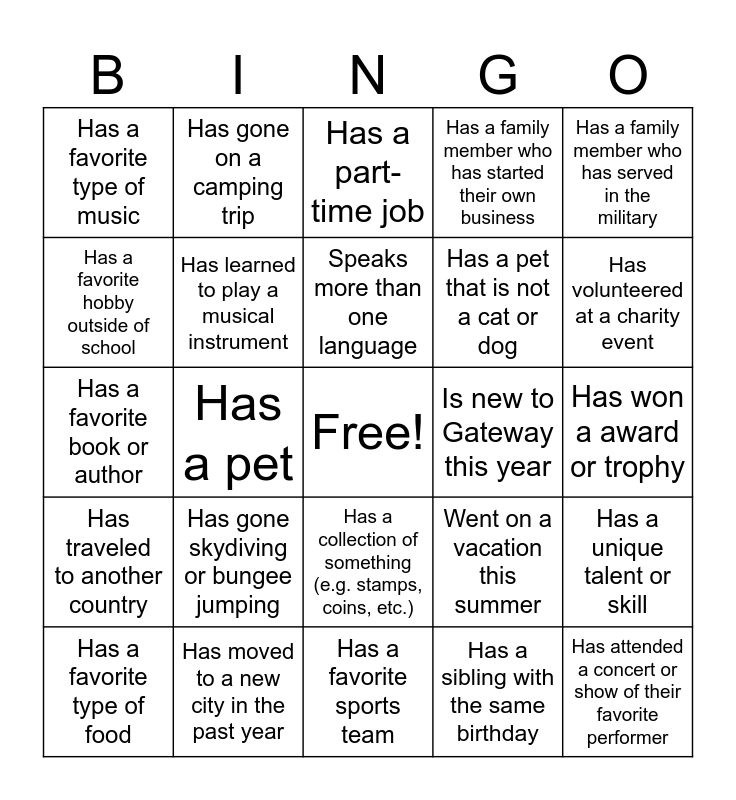 This bingo card has a free space and 24 words: Has a favorite type of food, Has gone skydiving or bungee jumping, Speaks more than one language, Has a sibling with the same birthday, Has a family member who has served in the military, Has a favorite type of music, Has gone on a camping trip, Has a part-time job, Is new to Gateway this year, Has won a award or trophy, Has a favorite book or author, Has learned to play a musical instrument, Went on a vacation this summer, Has a unique talent or skill, Has a favorite hobby outside of school, Has moved to a new city in the past year, Has a favorite sports team, Has a family member who has started their own business, Has volunteered at a charity event, Has traveled to another country, Has a pet, Has a collection of something (e.g. stamps, coins, etc.), Has a pet that is not a cat or dog and Has attended a concert or show of their favorite performer.