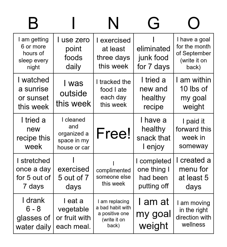 This bingo card has a free space and 24 words: I drank 6 - 8 glasses of water daily, I exercised 5 out of 7 days, I tracked the food I ate each day this week, I am at my goal weight, I have a goal for the month of September (write it on back), I am getting 6 or more hours of sleep every night, I use zero point foods daily, I exercised at least three days this week, I have a healthy snack that I enjoy, I paid it forward this week in someway, I tried a new recipe this week, I was outside this week, I completed one thing I had been putting off, I created a menu for at least 5 days, I watched a sunrise or sunset this week, I eat a vegetable or fruit with each meal., I am replacing a bad habit with a positive one (write it on back), I eliminated junk food for 7 days, I am within 10 lbs of my goal weight, I stretched once a day for 5 out of 7 days, I cleaned and organized a space in my house or car, I complimented someone else this week, I tried a new and healthy recipe and I am moving in the right direction with wellness.