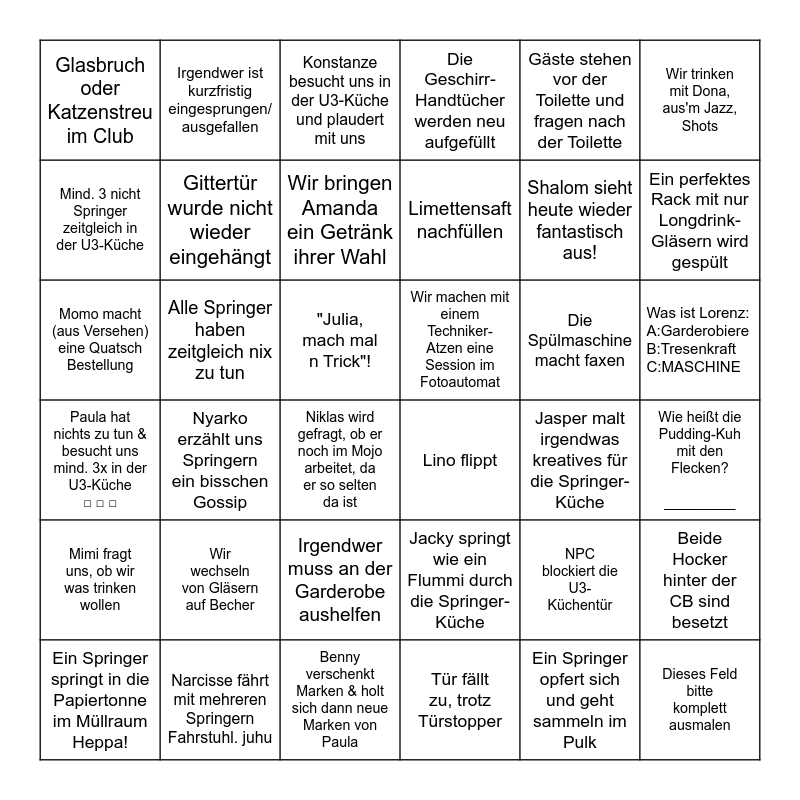 This bingo card has 36 words: Jacky springt wie ein Flummi durch die Springer-Küche, Irgendwer muss an der Garderobe aushelfen, Tür fällt zu, trotz Türstopper, Mind. 3 nicht Springer zeitgleich in der U3-Küche, Paula hat nichts zu tun & besucht uns mind. 3x in der U3-Küche □ □ □, Wir machen mit einem Techniker-Atzen eine Session im Fotoautomat, Gittertür wurde nicht wieder eingehängt, Benny verschenkt Marken & holt sich dann neue Marken von Paula, Gäste stehen vor der Toilette und fragen nach der Toilette, NPC blockiert die U3-Küchentür, Ein perfektes Rack mit nur Longdrink-Gläsern wird gespült, Die Geschirr-Handtücher werden neu aufgefüllt, Beide Hocker hinter der CB sind besetzt, Alle Springer haben zeitgleich nix zu tun, Limettensaft nachfüllen, Glasbruch oder Katzenstreu im Club, Mimi fragt uns, ob wir was trinken wollen, Die Spülmaschine macht faxen, Momo macht (aus Versehen) eine Quatsch Bestellung, Konstanze besucht uns in der U3-Küche und plaudert mit uns, "Julia, mach mal n Trick"!, Nyarko erzählt uns Springern ein bisschen Gossip, Lino flippt, Niklas wird gefragt, ob er noch im Mojo arbeitet, da er so selten da ist, Jasper malt irgendwas kreatives für die Springer-Küche, Irgendwer ist kurzfristig eingesprungen/ ausgefallen, Shalom sieht heute wieder fantastisch aus!, Narcisse fährt mit mehreren Springern Fahrstuhl. juhu, Wir bringen Amanda ein Getränk ihrer Wahl, Wir trinken mit Dona, aus'm Jazz, Shots, Dieses Feld bitte komplett ausmalen, Ein Springer springt in die Papiertonne im Müllraum Heppa!, Wie heißt die Pudding-Kuh mit den Flecken? _________, Was ist Lorenz: A:Garderobiere B:Tresenkraft C:MASCHINE, Wir wechseln von Gläsern auf Becher and Ein Springer opfert sich und geht sammeln im Pulk.