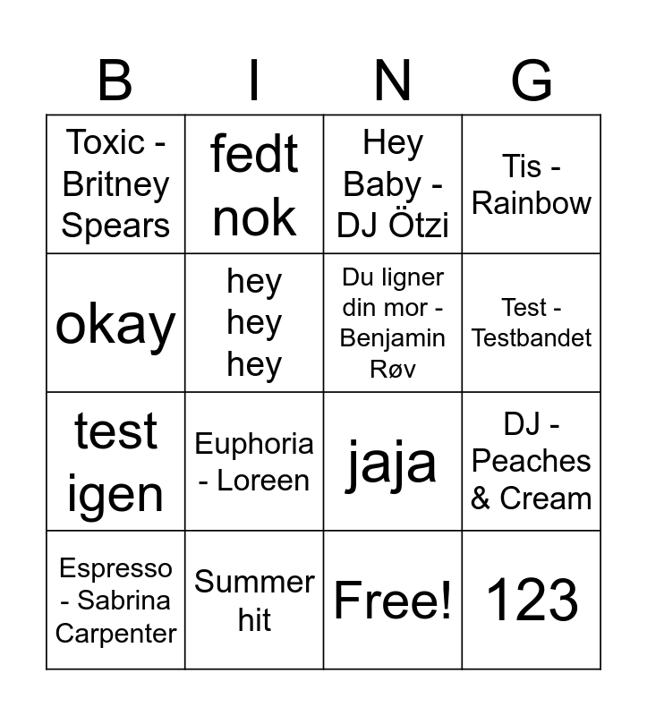 This bingo card has 17 words: Free!, Espresso - Sabrina Carpenter, Hey Baby - DJ Ötzi, Toxic - Britney Spears, Euphoria - Loreen, Tis - Rainbow, DJ - Peaches & Cream, Du ligner din mor - Benjamin Røv, Test - Testbandet, hey hey hey, Summer hit, jaja, okay, fedt nok, test igen, jajaokay hvor fedt and 123.