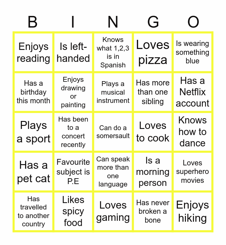 This bingo card has a free space and 25 words: Favourite subject is P.E, Loves gaming, Plays a musical instrument, Has travelled to another country, Is wearing something blue, Enjoys reading, Has a birthday this month, Is left-handed, Loves to cook, Can speak more than one language, Has more than one sibling, Plays a sport, Is a morning person, Loves superhero movies, Enjoys drawing or painting, Has a part-time job, Knows how to dance, Knows what 1,2,3 is in Spanish, Has a Netflix account, Has been to a concert recently, Enjoys hiking, Likes spicy food, Has a pet cat, Loves pizza and Has never broken a bone.