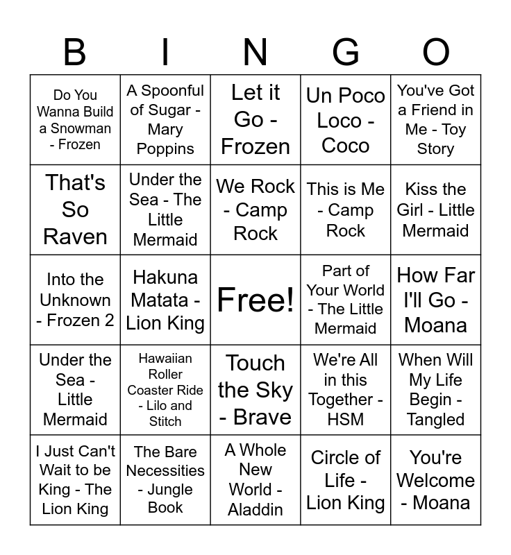 This bingo card has a free space and 29 words: I Just Can't Wait to be King - The Lion King, Love is an Open Door - Frozen, Hakuna Matata - Lion King, Life is a Highway - Cars, Do You Wanna Build a Snowman - Frozen, Let it Go - Frozen, Under the Sea - The Little Mermaid, Hawaiian Roller Coaster Ride - Lilo and Stitch, Part of Your World - The Little Mermaid, The Bare Necessities - Jungle Book, How Far I'll Go - Moana, You're Welcome - Moana, A Whole New World - Aladdin, Circle of Life - Lion King, Kiss the Girl - Little Mermaid, When You Wish Upon A Star - Pinocchio, Touch the Sky - Brave, Under the Sea - Little Mermaid, You've Got a Friend in Me - Toy Story, Into the Unknown - Frozen 2, We're All in this Together - HSM, The Best of Both Worlds - Hannah Montana, This is Me - Camp Rock, That's So Raven, Un Poco Loco - Coco, A Spoonful of Sugar - Mary Poppins, When Will My Life Begin - Tangled, We Rock - Camp Rock and Amigas Cheetahs - Cheetah Girls.