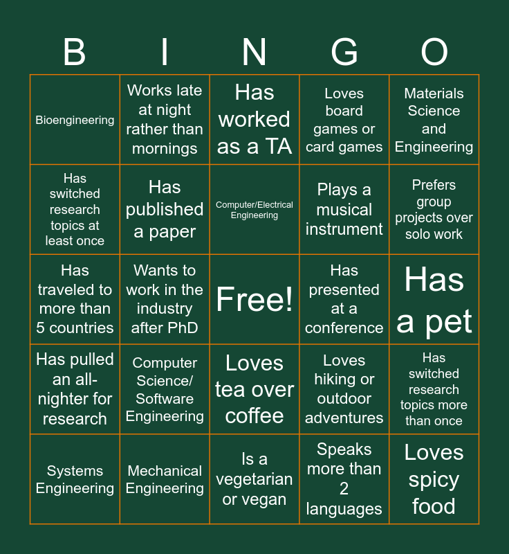 This bingo card has a free space and 24 words: Computer Science/ Software Engineering, Mechanical Engineering, Computer/Electrical Engineering, Systems Engineering, Materials Science and Engineering, Bioengineering, Has switched research topics at least once, Works late at night rather than mornings, Has presented at a conference, Loves tea over coffee, Plays a musical instrument, Has traveled to more than 5 countries, Loves hiking or outdoor adventures, Has switched research topics more than once, Has published a paper, Speaks more than 2 languages, Has a pet, Has worked as a TA, Prefers group projects over solo work, Wants to work in the industry after PhD, Loves spicy food, Has pulled an all-nighter for research, Loves board games or card games and Is a vegetarian or vegan.