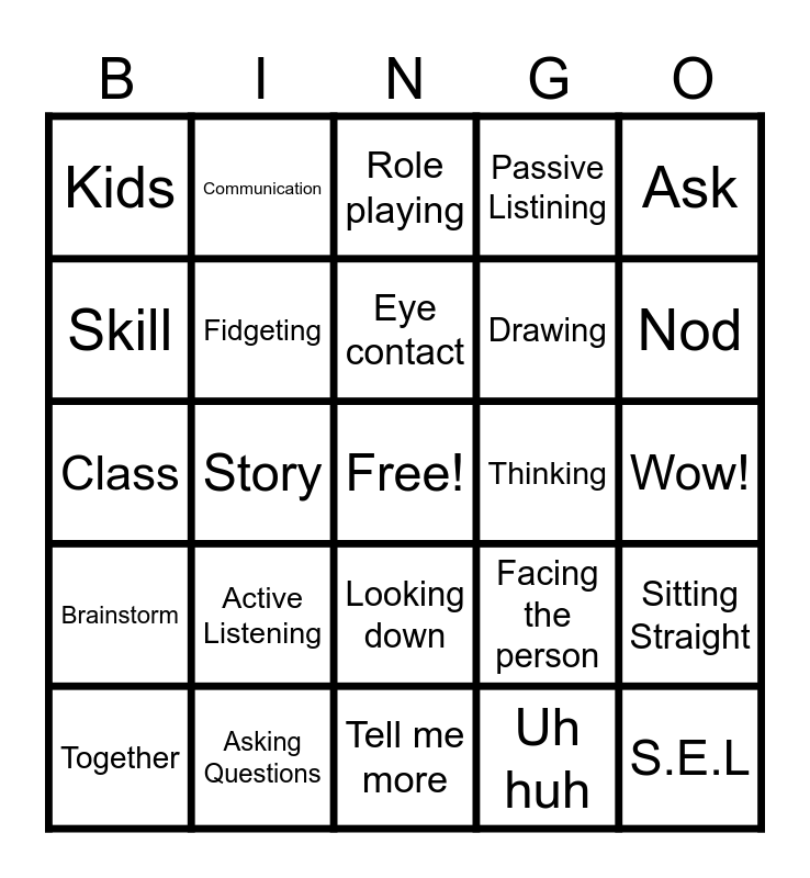 This bingo card has a free space and 24 words: Active Listening, Asking Questions, Eye contact, Together, Ask, Kids, Skill, Communication, Thinking, Looking down, Drawing, Class, Facing the person, Sitting Straight, Fidgeting, Uh huh, Wow!, Role playing, Nod, Story, S.E.L, Brainstorm, Passive Listining and Tell me more.