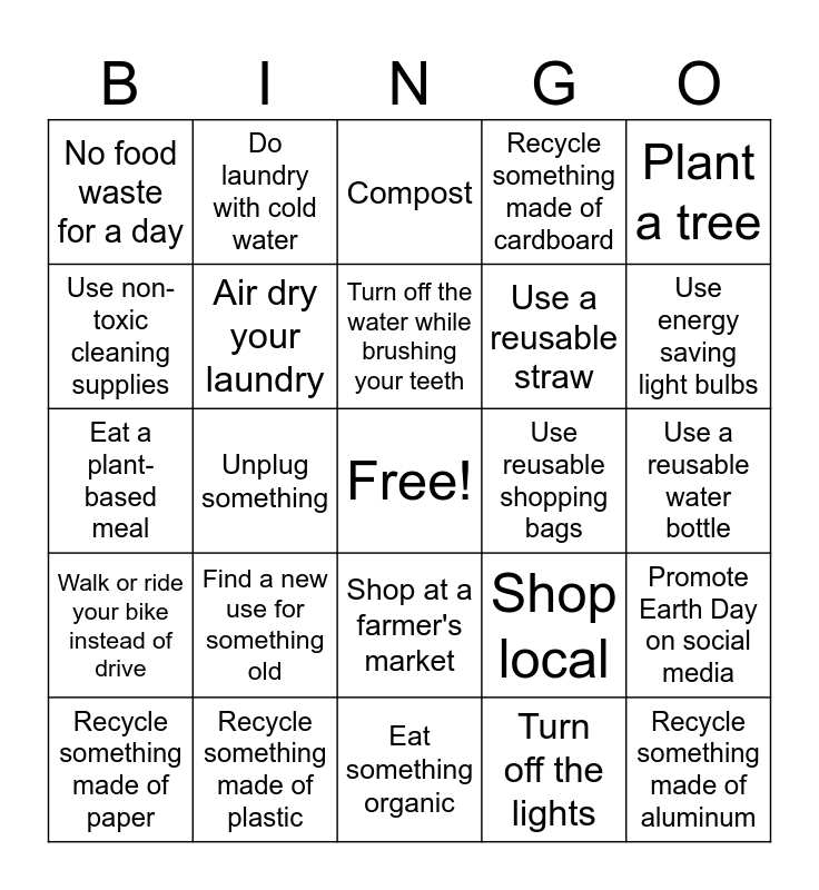 This bingo card has a free space and 27 words: Shop local, Switch to reusable batteries, Use a reusable straw, Eat something organic, Use non-toxic cleaning supplies, Compost, Do laundry with cold water, Walk or ride your bike instead of drive, Use reusable shopping bags, Promote Earth Day on social media, Eat a plant-based meal, Recycle something made of cardboard, Recycle something made of paper, Recycle something made of plastic, Use energy saving light bulbs, Take a shorter shower, Air dry your laundry, Turn off the water while brushing your teeth, Find a new use for something old, No food waste for a day, Use a reusable water bottle, Turn off the lights, Unplug something, Recycle something made of aluminum, Shop at a farmer's market, Plant a tree and Go outside.