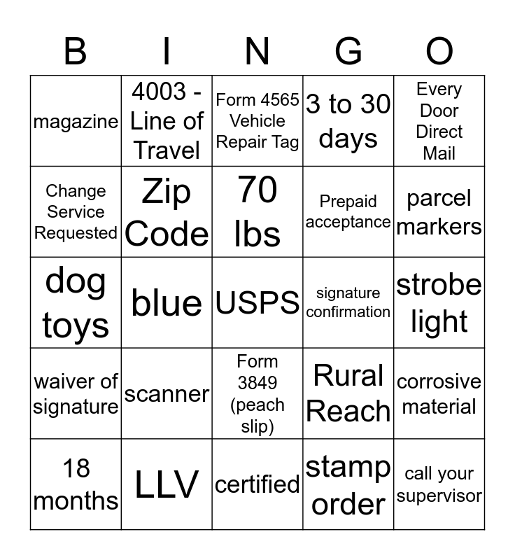 This bingo card has a free space and 24 words: scanner, LLV, 70 lbs, 18 months, Every Door Direct Mail, magazine, Change Service Requested, 4003 - Line of Travel, signature confirmation, Form 3849 (peach slip), Prepaid acceptance, dog toys, Rural Reach, corrosive material, Zip Code, stamp order, strobe light, Form 4565 Vehicle Repair Tag, parcel markers, blue, call your supervisor, waiver of signature, 3 to 30 days and certified.