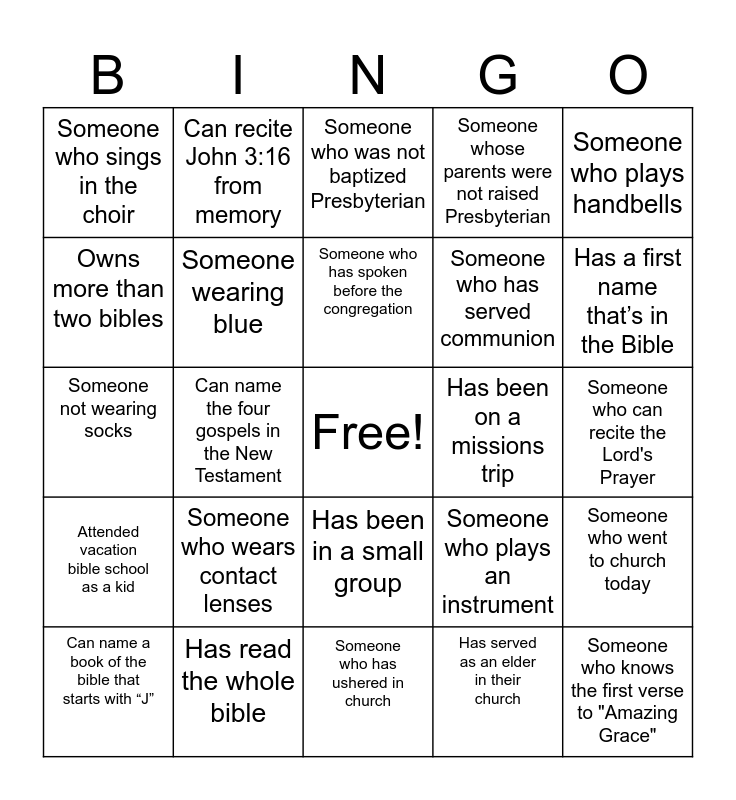 This bingo card has a free space and 28 words: Someone who went to church today, Someone who can say "God Bless You" in a language other than English, Someone who has served communion, Has served as an elder in their church, Owns more than two bibles, Someone who was not baptized Presbyterian, Can recite John 3:16 from memory, Attended vacation bible school as a kid, Has been on a missions trip, Can name a book of the bible that starts with “J”, Someone not wearing socks, Someone whose parents were not raised Presbyterian, Has read the whole bible, Someone who has ushered in church, Has a first name that’s in the Bible, Someone born on a holiday, Someone who wears contact lenses, Someone wearing blue, Someone who has spoken before the congregation, Has been in a small group, Someone who sings in the choir, Someone who has attended a Catholic mass, Someone who knows the first verse to "Amazing Grace", Can name the four gospels in the New Testament, Someone who can recite the Lord's Prayer, Someone who plays an instrument, Someone who plays handbells and Someone who can count to 10 in Spanish.