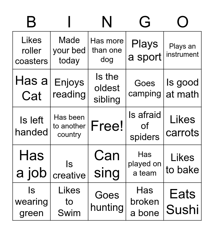 This bingo card has a free space and 24 words: Is creative, Likes to Swim, Is the oldest sibling, Is wearing green, Plays an instrument, Likes roller coasters, Has a Cat, Made your bed today, Is afraid of spiders, Can sing, Goes camping, Is left handed, Has played on a team, Likes to bake, Enjoys reading, Has broken a bone, Likes carrots, Has more than one dog, Is good at math, Has been to another country, Eats Sushi, Has a job, Plays a sport and Goes hunting.
