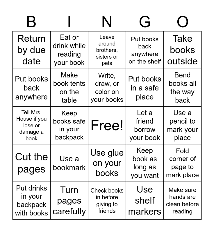 This bingo card has a free space and 24 words: Use a bookmark, Turn pages carefully, Write, draw, or color on your books, Put drinks in your backpack with books, Take books outside, Return by due date, Put books back anywhere, Eat or drink while reading your book, Let a friend borrow your book, Use glue on your books, Put books in a safe place, Tell Mrs. House if you lose or damage a book, Keep book as long as you want, Fold corner of page to mark place, Make book tents on the table, Use shelf markers, Use a pencil to mark your place, Leave around brothers, sisters or pets, Bend books all the way back, Keep books safe in your backpack, Make sure hands are clean before reading, Cut the pages, Put books back anywhere on the shelf and Check books in before giving to friends.