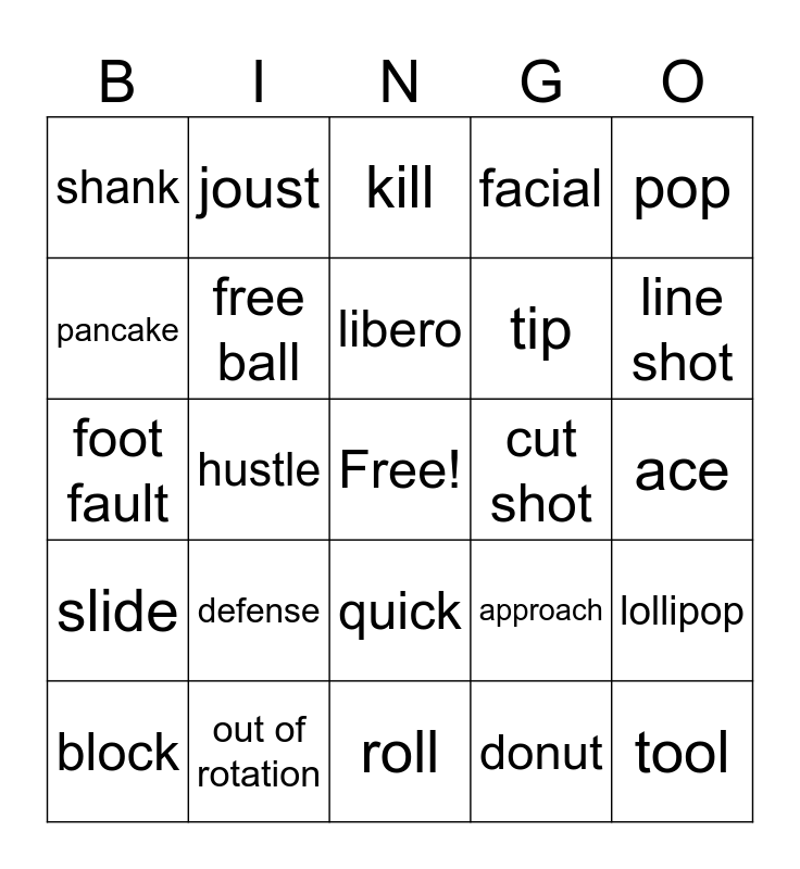 This bingo card has a free space and 29 words: block, spike, hustle, dive, shank, kill, free ball, defense, cut shot, out of rotation, ace, tool, roll, donut, line shot, serve, quick, slide, pop, foot fault, approach, rotation, tip, pancake, facial, joust, lollipop, libero and practice.