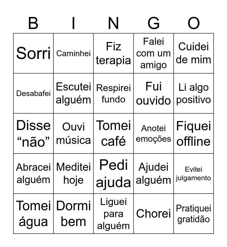 This bingo card has a free space and 24 words: Meditei hoje, Dormi bem, Respirei fundo, Tomei água, Cuidei de mim, Sorri, Desabafei, Caminhei, Anotei emoções, Pedi ajuda, Fui ouvido, Disse “não”, Ajudei alguém, Evitei julgamento, Escutei alguém, Chorei, Fiquei offline, Fiz terapia, Li algo positivo, Ouvi música, Pratiquei gratidão, Abracei alguém, Falei com um amigo and Liguei para alguém.