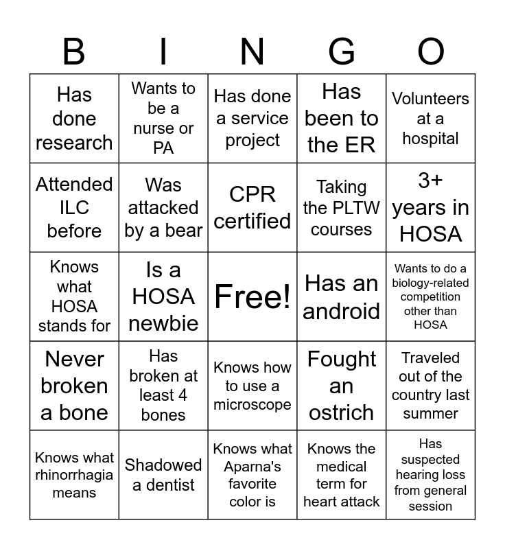 This bingo card has a free space and 24 words: Has broken at least 4 bones, Shadowed a dentist, CPR certified, Knows what rhinorrhagia means, Volunteers at a hospital, Has done research, Attended ILC before, Wants to be a nurse or PA, Has an android, Knows how to use a microscope, Taking the PLTW courses, Knows what HOSA stands for, Fought an ostrich, Traveled out of the country last summer, Was attacked by a bear, Knows the medical term for heart attack, Wants to do a biology-related competition other than HOSA, Has done a service project, 3+ years in HOSA, Is a HOSA newbie, Has suspected hearing loss from general session, Never broken a bone, Has been to the ER and Knows what Aparna's favorite color is.