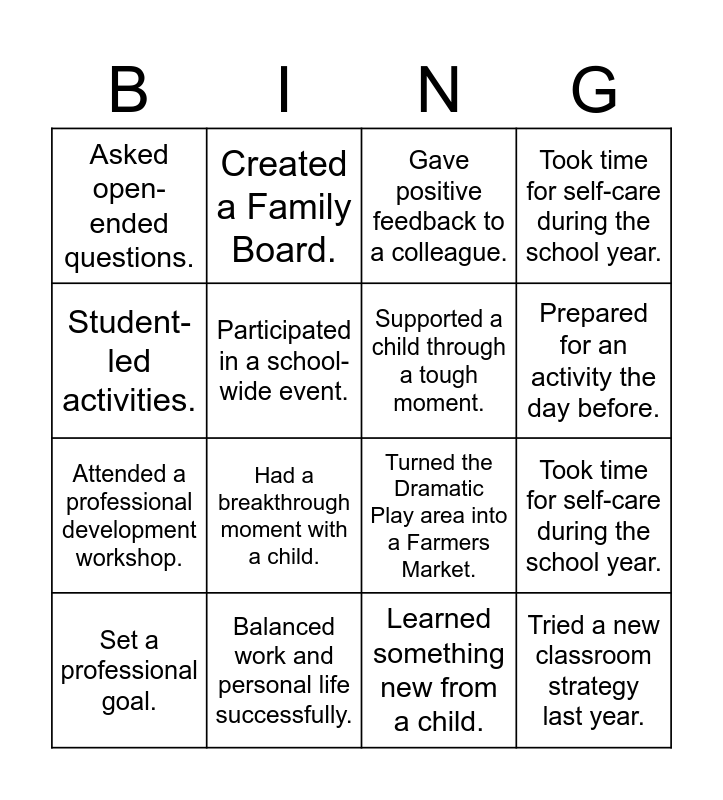 This bingo card has 58 words: Used Music or Movement in a lesson., Had a breakthrough moment with a child., Set a personal goal for professional growth., Tried a new classroom strategy last year., Designed a hands-on activity., Learned something new from a colleague., Supported a child through a tough moment., Decorated your classroom for a theme or season., Attended a professional development workshop., Made classroom labels in English & Home-Language., Took time for self-care during the school year., Turned the Dramatic Play area into a Farmers Market., Adapted a lesson to meet a child’s individual needs., Reflected on a challenging moment and grew from it, Built a strong bond with a student., Asked open-ended questions., Set a professional goal., Student-led activities., Rotated toys in the classroom., Prepared for an activity the day before., Balanced work and personal life successfully., Gave positive feedback to a colleague., Collaborated with a co-teacher on a lesson plan., Created a take home Book-Bag., Had a meaningful conversation with a parent., Learned something new from a child., Created classroom rules with the students., Used Music or Movement in a lesson., Had a breakthrough moment with a child., Set a personal goal for professional growth., Tried a new classroom strategy last year., Designed a hands-on activity., Learned something new from a colleague., Supported a child through a tough moment., Decorated your classroom for a theme or season., Attended a professional development workshop., Made classroom labels in English & Home-Language., Took time for self-care during the school year., Turned the Dramatic Play area into a Farmers Market., Adapted a lesson to meet a child’s individual needs., Reflected on a challenging moment and grew from it, Built a strong bond with a student., Asked open-ended questions., Set a professional goal., Student-led activities., Rotated toys in the classroom., Prepared for an activity the day before., Balanced work and personal life successfully., Gave positive feedback to a colleague., Collaborated with a co-teacher on a lesson plan., Created a take home Book-Bag., Had a meaningful conversation with a parent., Learned something new from a child., Created classroom rules with the students., Created a Family Board., Shared a resource or idea with your team., Participated in a school-wide event. and Celebrated a child’s milestone..