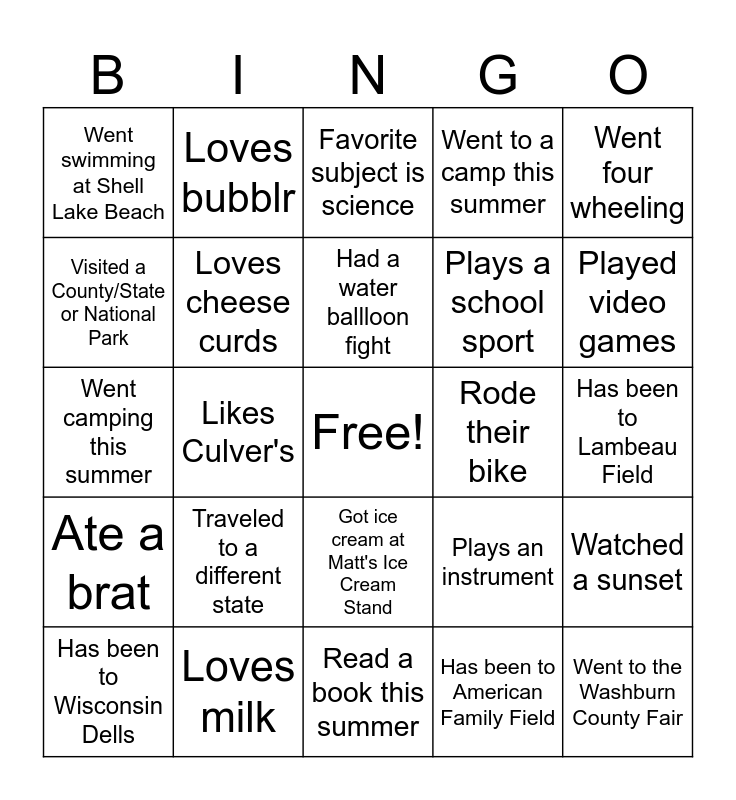 This bingo card has a free space and 29 words: Has been to Wisconsin Dells, Has a pet dog or cat, Likes Culver's, New to Shell Lake School District, Went swimming at Shell Lake Beach, Favorite subject is science, Loves cheese curds, Traveled to a different state, Rode their bike, Loves milk, Has been to Lambeau Field, Went to the Washburn County Fair, Read a book this summer, Has been to American Family Field, Played video games, Went fishing, Got ice cream at Matt's Ice Cream Stand, Ate a brat, Went four wheeling, Went camping this summer, Plays an instrument, Likes board games or cards, Plays a school sport, Visited a County/State or National Park, Went to a camp this summer, Loves bubblr, Watched a sunset, Had a water ballloon fight and Spent time with friends.