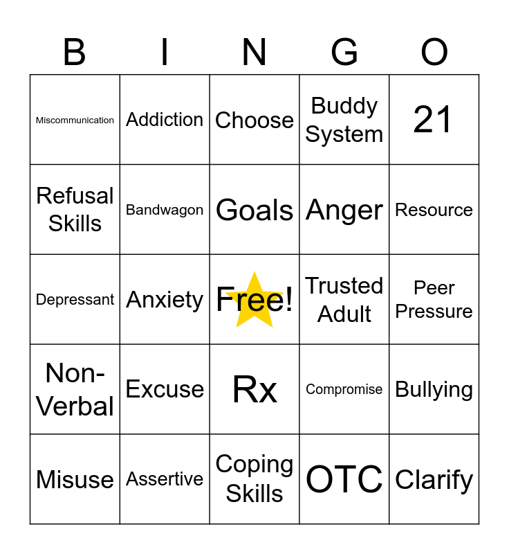 This bingo card has a free space and 29 words: Misuse, Stimulant, Anxiety, Consider, Miscommunication, Choose, Bandwagon, Excuse, Trusted Adult, Assertive, Peer Pressure, Clarify, Coping Skills, OTC, Resource, 25, Rx, Non-Verbal, 21, Depressant, Compromise, Verbal, Anger, Refusal Skills, Buddy System, Addiction, Bullying, Goals and Consequence.