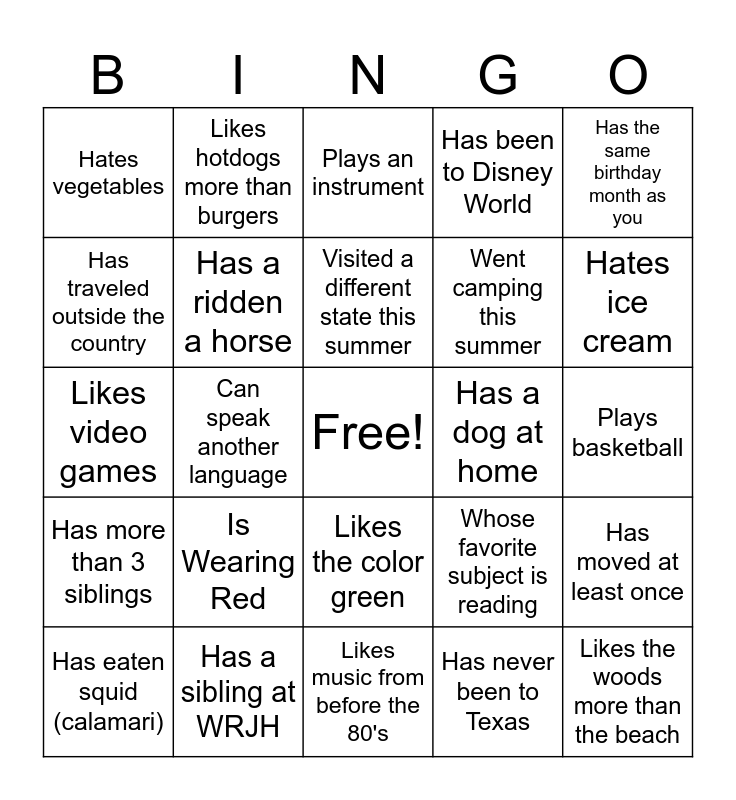 This bingo card has a free space and 24 words: Is Wearing Red, Has a sibling at WRJH, Visited a different state this summer, Has eaten squid (calamari), Has the same birthday month as you, Hates vegetables, Has traveled outside the country, Likes hotdogs more than burgers, Has a dog at home, Likes the color green, Went camping this summer, Likes video games, Whose favorite subject is reading, Has moved at least once, Has a ridden a horse, Has never been to Texas, Plays basketball, Plays an instrument, Hates ice cream, Can speak another language, Likes the woods more than the beach, Has more than 3 siblings, Has been to Disney World and Likes music from before the 80's.