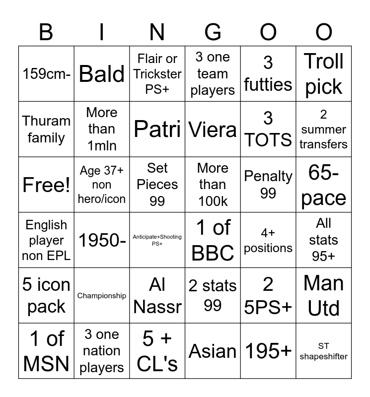 This bingo card has 36 words: 2 stats 99, Al Nassr, Asian, Thuram family, English player non EPL, More than 100k, More than 1mln, 5 + CL's, 3 futties, 2 5PS+, 2 summer transfers, 3 one team players, Man Utd, Age 37+ non hero/icon, Viera, 159cm-, 5 icon pack, Penalty 99, Free!, Flair or Trickster PS+, Set Pieces 99, 1950-, 1 of BBC, Anticipate+Shooting PS+, 4+ positions, Bald, 3 TOTS, 3 one nation players, Patri, Troll pick, ST shapeshifter, 1 of MSN, All stats 95+, 65- pace, Championship and 195+.