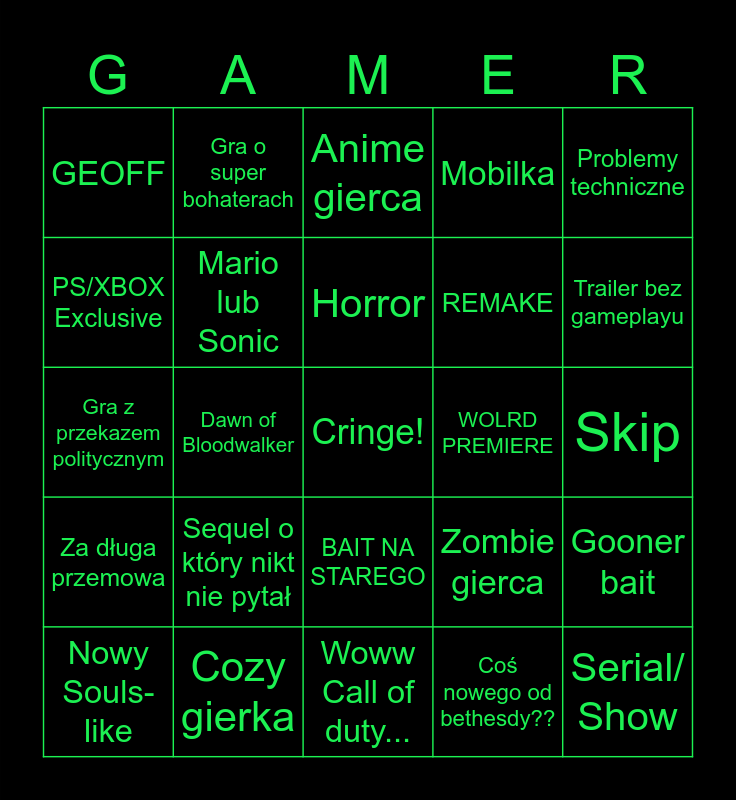 This bingo card has a free space and 29 words: Nowy Souls-like, Gacha, Dawn of Bloodwalker, Cozy gierka, GEOFF, Anime gierca, Mario lub Sonic, Sequel o który nikt nie pytał, WOLRD PREMIERE, Cozy gierka, Skip, Serial/ Show, Woww Call of duty..., Coś nowego od bethesdy??, Trailer bez gameplayu, Wiesiek czwarty, BAIT NA STAREGO, Za długa przemowa, Problemy techniczne, Gra z przekazem politycznym, Zombie gierca, Final (?) Fantasy, REMAKE, PS/XBOX Exclusive, Mobilka, Gra o super bohaterach, Gooner bait, Horror and Friend slop.