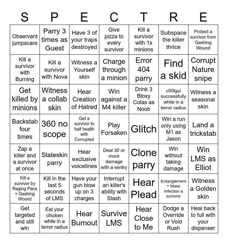 This bingo card has a free space and 48 words: Hear Plead, Find a skid, Survive LMS, 360 no scope, Hear Creation of Hatred, Land a trickstab, Parry 3 times as Guest, Eat your chicken while in a terror radius, Subspace the killer thrice, Deal 30 or more damage with a sentry, Protect a survivor from Gashing Wound, Give pizza to every survivor, c00lgui successfully while in a terror radius, Drink 3 Bloxy Colas as Noob, Kill a survivor by Raging Pace + Gashing Wound, Win a run only using M1 as Jason, Kill a survivor with Burning, Corrupt Nature snipe, Entanglement + Mass Infection a survivor, Kill a survivor with 1x minions, Error 404 parry, Get a survivor to half health with Corrupted, Observant jumpscare, Kill a survivor with Nova, Witness a Golden skin, Witness a Yourself skin, Witness a seasonal skin, Get targeted and still win, Win against a M4 killer, Witness a collab skin, Dodge a Override or Void Rush, Glitch, Win LMS as Elliot, Kill in the last 5 seconds of LMS, Backstab four times, Clone parry, Win without taking damage, Get killed by minions, Hear exclusive voicelines, Have your gun blow up on 3 charges, Zap a killer and a survivor at once, Heal back to full with your dispenser, Have 3 of your traps destroyed, Hear Burnout, Charge through a minion, Interrupt an killer's ability with Slash, Slateskin parry and Hear Close to Me.