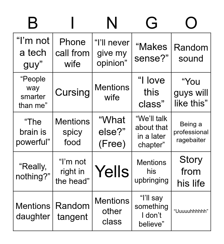 This bingo card has a free space and 24 words: “I’m not right in the head”, Random tangent, Mentions wife, Mentions daughter, Random sound, “I’m not a tech guy”, “People way smarter than me”, Phone call from wife, “We’ll talk about that in a later chapter”, Yells, “I love this class”, “The brain is powerful”, Mentions his upbringing, Story from his life, Cursing, “I’ll say something I don’t believe”, Being a professional ragebaiter, “I’ll never give my opinion”, “You guys will like this”, Mentions spicy food, “Uuuuuhhhhhh”, “Really, nothing?”, “Makes sense?” and Mentions other class.