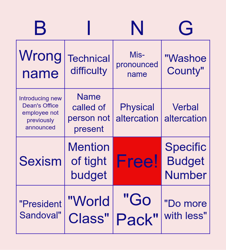 This bingo card has 16 words: "World Class", Specific Budget Number, Mis-pronounced name, Wrong name, Sexism, Technical difficulty, Free!, "Go Pack", Introducing new Dean's Office employee not previously announced, Name called of person not present, "President Sandoval", "Washoe County", Mention of tight budget, Verbal altercation, Physical altercation and "Do more with less".