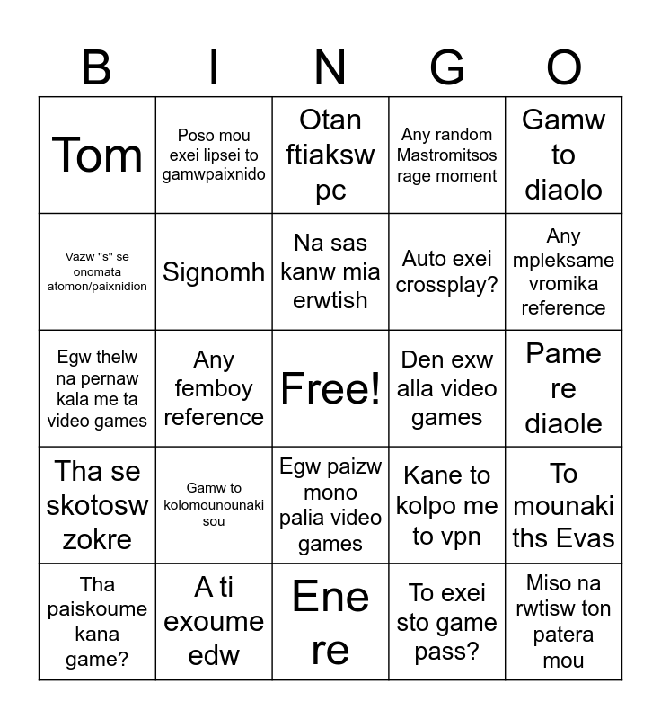 This bingo card has a free space and 25 words: Gamw to kolomounounaki sou, Ene re, Na sas kanw mia erwtish, Tha paiskoume kana game?, Gamw to diaolo, Tom, Vazw "s" se onomata atomon/paixnidion, Poso mou exei lipsei to gamwpaixnido, Den exw alla video games, Egw paizw mono palia video games, Auto exei crossplay?, Egw thelw na pernaw kala me ta video games, Kane to kolpo me to vpn, To mounaki ths Evas, Signomh, 😭, Pame re diaole, Otan ftiaksw pc, Any mpleksame vromika reference, Any femboy reference, Miso na rwtisw ton patera mou, A ti exoume edw, Tha se skotosw zokre, Any random Mastromitsos rage moment and To exei sto game pass?.