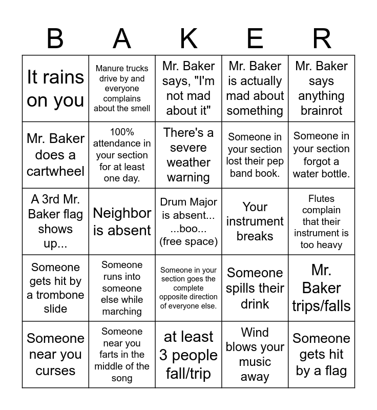 This bingo card has a free space and 29 words: Someone near you curses, Your instrument injures you, Neighbor is absent, Someone lost their instrument, It rains on you, Mr. Baker says, "I'm not mad about it", 100% attendance in your section for at least one day., Someone runs into someone else while marching, Your instrument breaks, Someone near you farts in the middle of the song, Flutes complain that their instrument is too heavy, Someone gets hit by a flag, at least 3 people fall/trip, Wind blows your music away, Someone in your section forgot a water bottle., Someone gets caught playing a game on their phone when they're not supposed to., Someone in your section goes the complete opposite direction of everyone else., Someone gets hit by a trombone slide, Mr. Baker says anything brainrot, A 3rd Mr. Baker flag shows up..., Someone spills their drink, your instrument breaks, Someone in your section lost their pep band book., Mr. Baker does a cartwheel, Mr. Baker is actually mad about something, Manure trucks drive by and everyone complains about the smell, Mr. Baker trips/falls, There's a severe weather warning and Someone drops their instrument.