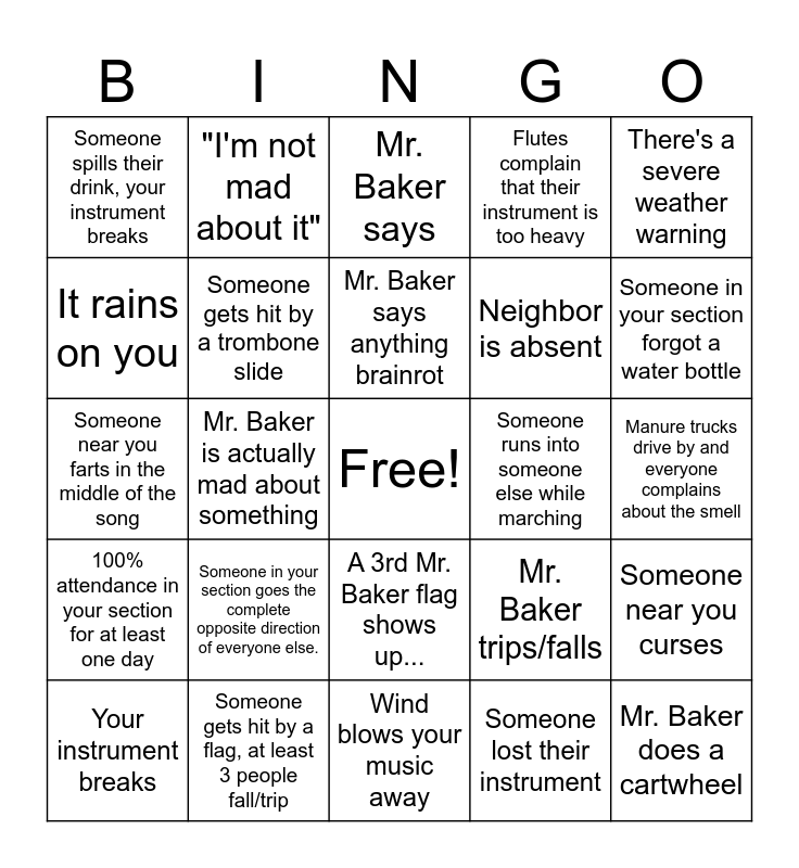 This bingo card has a free space and 28 words: Someone near you curses, Your instrument injures you, Neighbor is absent, Someone lost their instrument, It rains on you, Mr. Baker says, "I'm not mad about it", 100% attendance in your section for at least one day, Someone runs into someone else while marching, Your instrument breaks, Someone near you farts in the middle of the song, Flutes complain that their instrument is too heavy, Someone gets hit by a flag, at least 3 people fall/trip, Wind blows your music away, Someone in your section forgot a water bottle, Someone gets caught playing a game on their phone when they're not supposed to., Someone in your section goes the complete opposite direction of everyone else., Someone gets hit by a trombone slide, Mr. Baker says anything brainrot, A 3rd Mr. Baker flag shows up..., Someone spills their drink, your instrument breaks, Someone in your section lost their pep band book., Mr. Baker does a cartwheel, Mr. Baker is actually mad about something, Manure trucks drive by and everyone complains about the smell, Mr. Baker trips/falls, There's a severe weather warning and Someone drops their instrument.