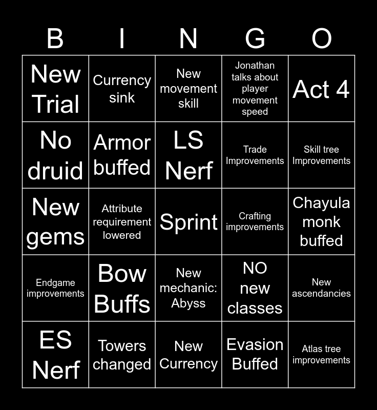 This bingo card has a free space and 24 words: Bow Buffs, Towers changed, LS Nerf, ES Nerf, Act 4, New Trial, No druid, Currency sink, Crafting improvements, New mechanic: Abyss, Trade Improvements, New gems, NO new classes, New ascendancies, Armor buffed, Evasion Buffed, Chayula monk buffed, New movement skill, Skill tree Improvements, Attribute requirement lowered, Atlas tree improvements, Endgame improvements, Jonathan talks about player movement speed and New Currency.