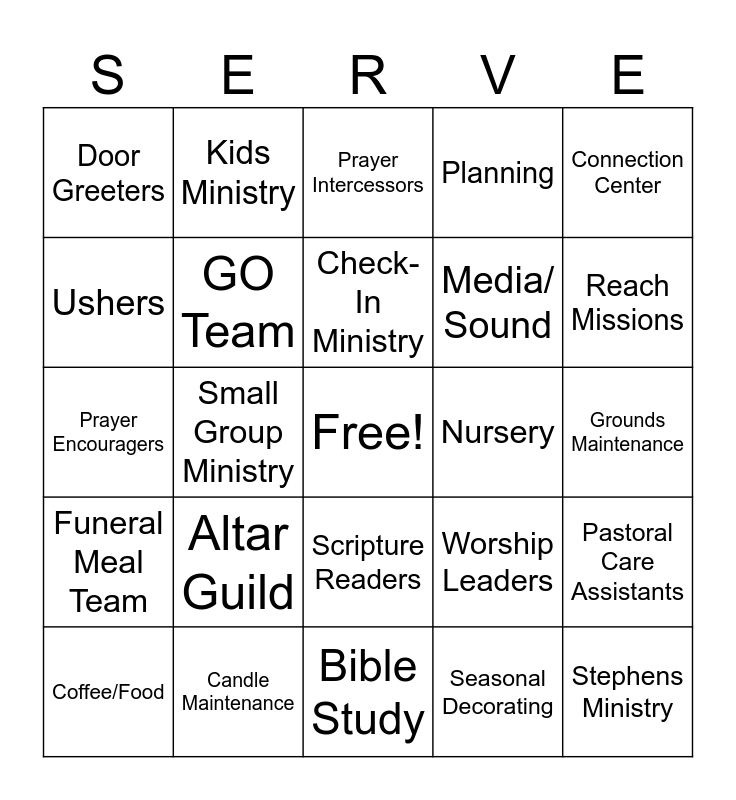 This bingo card has a free space and 24 words: Altar Guild, Candle Maintenance, Check-In Ministry, Coffee/Food, Connection Center, Door Greeters, Ushers, Kids Ministry, Nursery, Scripture Readers, Media/ Sound, Prayer Encouragers, Worship Leaders, Pastoral Care Assistants, GO Team, Seasonal Decorating, Grounds Maintenance, Prayer Intercessors, Reach Missions, Small Group Ministry, Stephens Ministry, Funeral Meal Team, Planning and Bible Study.