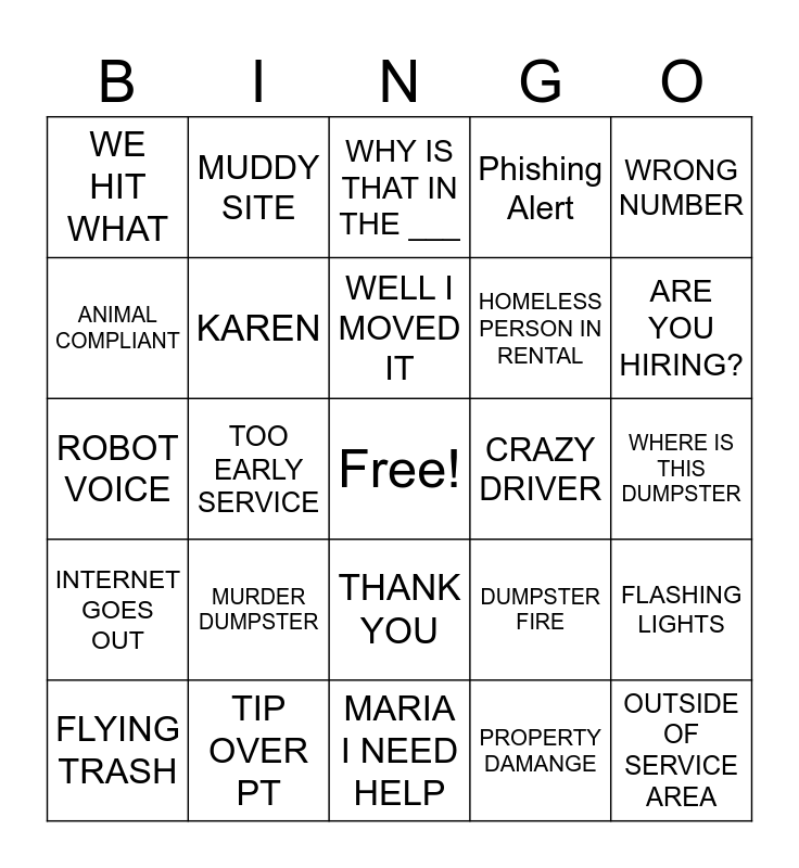This bingo card has a free space and 24 words: MURDER DUMPSTER, TIP OVER PT, WELL I MOVED IT, FLYING TRASH, WRONG NUMBER, WE HIT WHAT, ANIMAL COMPLIANT, MUDDY SITE, CRAZY DRIVER, THANK YOU, HOMELESS PERSON IN RENTAL, ROBOT VOICE, DUMPSTER FIRE, FLASHING LIGHTS, KAREN, PROPERTY DAMANGE, WHERE IS THIS DUMPSTER, WHY IS THAT IN THE ___, ARE YOU HIRING?, TOO EARLY SERVICE, OUTSIDE OF SERVICE AREA, INTERNET GOES OUT, Phishing Alert and MARIA I NEED HELP.