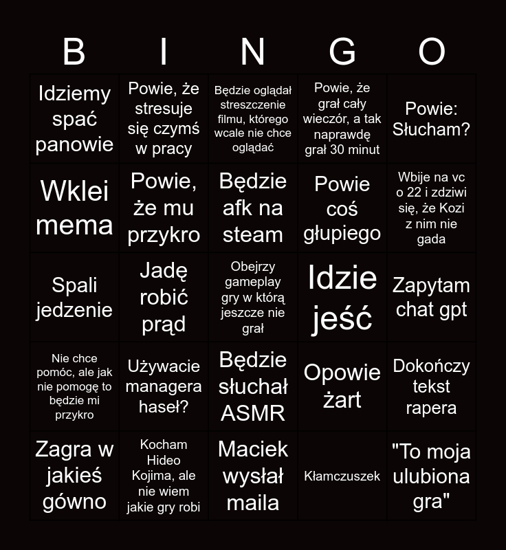 This bingo card has 25 words: Używacie managera haseł?, Maciek wysłał maila, Będzie afk na steam, Zagra w jakieś gówno, Powie: Słucham?, Idziemy spać panowie, Wklei mema, Powie, że stresuje się czymś w pracy, Idzie jeść, Będzie słuchał ASMR, Powie coś głupiego, Spali jedzenie, Opowie żart, Dokończy tekst rapera, Powie, że mu przykro, "To moja ulubiona gra", Zapytam chat gpt, Będzie oglądał streszczenie filmu, którego wcale nie chce oglądać, Wbije na vc o 22 i zdziwi się, że Kozi z nim nie gada, Jadę robić prąd, Obejrzy gameplay gry w którą jeszcze nie grał, Kocham Hideo Kojima, ale nie wiem jakie gry robi, Nie chce pomóc, ale jak nie pomogę to będzie mi przykro, Powie, że grał cały wieczór, a tak naprawdę grał 30 minut and Kłamczuszek.