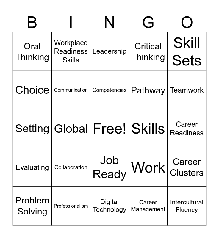 This bingo card has a free space and 29 words: Problem Solving, Work Ethic, Global, Career, Oral Thinking, Leadership, Communication, Collaboration, Skills, Professionalism, Career Readiness, Intercultural Fluency, Digital Technology, Career Management, Teamwork, Critical Thinking, Job Ready, Evaluating, Skill Sets, Setting, Work, Career Path, Pathway, Choice, Critical Thinking, Workplace Readiness Skills, Career Clusters, Competencies and Workplace Readiness Skills.