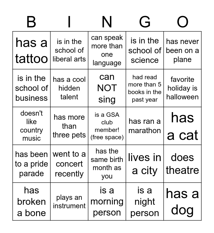 This bingo card has a free space and 29 words: has broken a bone, travelled out of the country recently, has more than three pets, is a member of another affinity club, has a tattoo, can speak more than one language, has a cool hidden talent, went to a concert recently, has ran a marathon, plays an instrument, has a cat, has a dog, is a morning person, is a night person, favorite holiday is halloween, doesn't like rollercoasters, has the same birth month as you, has been to a pride parade, has never been on a plane, doesn't like country music, lives in a city, lives on a farm/rural area, had read more than 5 books in the past year, is in the school of business, is in the school of science, is in the school of liberal arts, does theatre, can NOT sing and has more than 2 siblings.