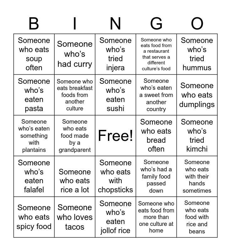 This bingo card has a free space and 24 words: Someone who eats rice a lot, Someone who loves tacos, Someone who’s eaten sushi, Someone who eats spicy food, Someone who’s tried hummus, Someone who eats soup often, Someone who’s eaten pasta, Someone who’s had curry, Someone who eats bread often, Someone who eats with chopsticks, Someone who’s eaten a sweet from another country, Someone who’s eaten something with plantains, Someone who’s had a family food passed down, Someone who eats with their hands sometimes, Someone who eats breakfast foods from another culture, Someone who eats food from more than one culture at home, Someone who’s tried kimchi, Someone who’s tried injera, Someone who eats dumplings, Someone who eats food made by a grandparent, Someone who eats food with rice and beans, Someone who’s eaten falafel, Someone who eats food from a restaurant that serves a different culture’s food and Someone who’s eaten jollof rice.