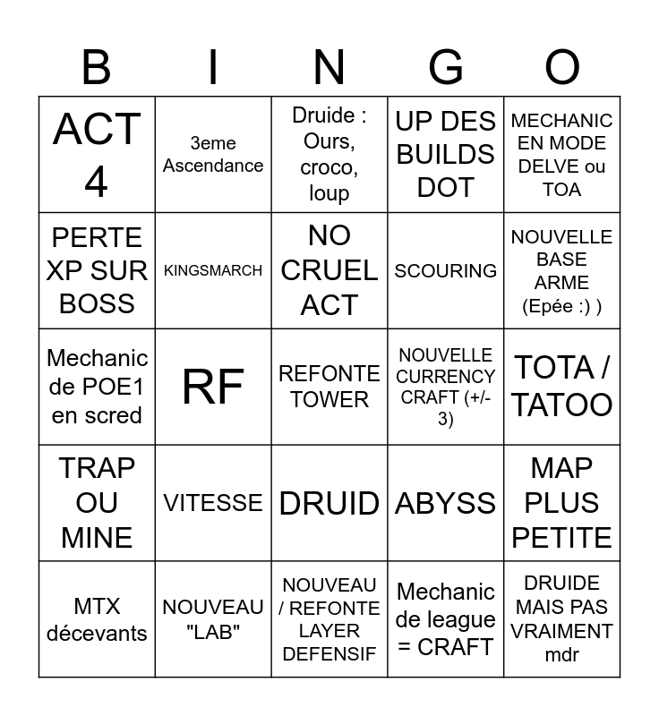 This bingo card has a free space and 24 words: VITESSE, NOUVEAU "LAB", NO CRUEL ACT, MTX décevants, MECHANIC EN MODE DELVE ou TOA, ACT 4, PERTE XP SUR BOSS, 3eme Ascendance, NOUVELLE CURRENCY CRAFT (+/- 3), DRUID, SCOURING, Mechanic de POE1 en scred, ABYSS, MAP PLUS PETITE, KINGSMARCH, Mechanic de league = CRAFT, TOTA / TATOO, Druide : Ours, croco, loup, NOUVELLE BASE ARME (Epée :) ), RF, DRUIDE MAIS PAS VRAIMENT mdr, TRAP OU MINE, UP DES BUILDS DOT and NOUVEAU / REFONTE LAYER DEFENSIF.