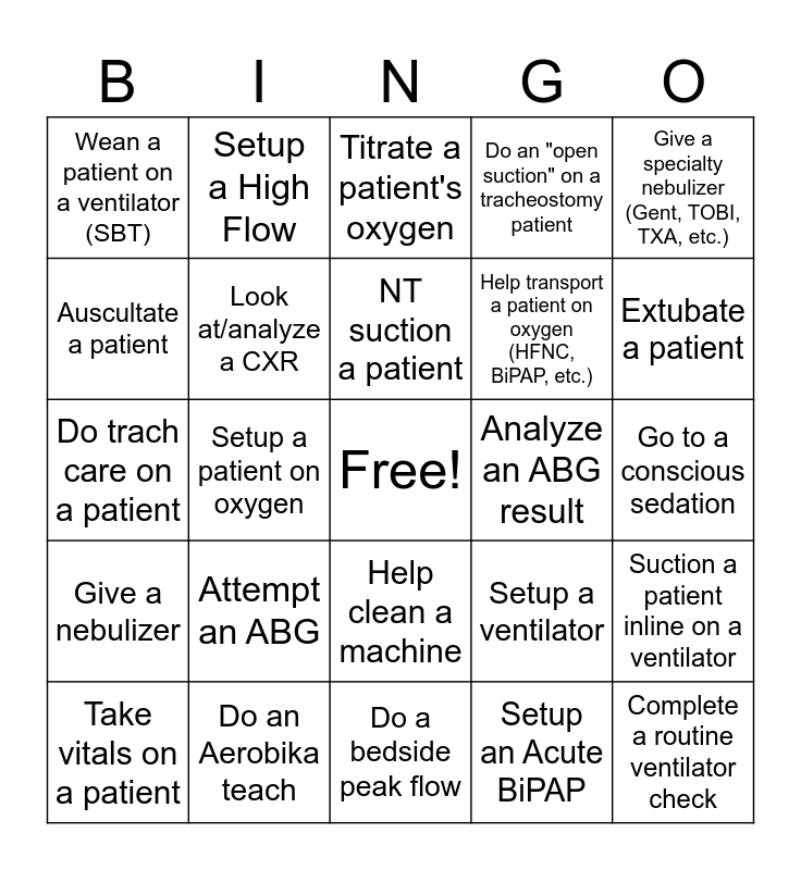 This bingo card has a free space and 24 words: Attempt an ABG, Do an Aerobika teach, NT suction a patient, Take vitals on a patient, Give a specialty nebulizer (Gent, TOBI, TXA, etc.), Wean a patient on a ventilator (SBT), Auscultate a patient, Setup a High Flow, Analyze an ABG result, Help clean a machine, Help transport a patient on oxygen (HFNC, BiPAP, etc.), Do trach care on a patient, Setup a ventilator, Suction a patient inline on a ventilator, Look at/analyze a CXR, Setup an Acute BiPAP, Go to a conscious sedation, Titrate a patient's oxygen, Extubate a patient, Setup a patient on oxygen, Complete a routine ventilator check, Give a nebulizer, Do an "open suction" on a tracheostomy patient and Do a bedside peak flow.