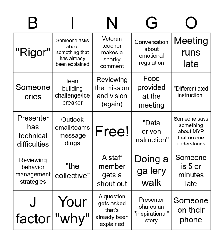 This bingo card has a free space and 24 words: "the collective", Your "why", Reviewing the mission and vision (again), J factor, Meeting runs late, "Rigor", Someone cries, Someone asks about something that has already been explained, "Data driven instruction", A staff member gets a shout out, Food provided at the meeting, Presenter has technical difficulties, Doing a gallery walk, Someone is 5 or minutes late, Team building challenge/ice breaker, Presenter shares an "inspirational" story, Someone says something about MYP that no one understands, Veteran teacher makes a snarky comment, "Differentiated instruction", Outlook email/teams message dings, Someone on their phone, Reviewing behavior management strategies, Conversation about emotional regulation and A question gets asked that's already been explained.