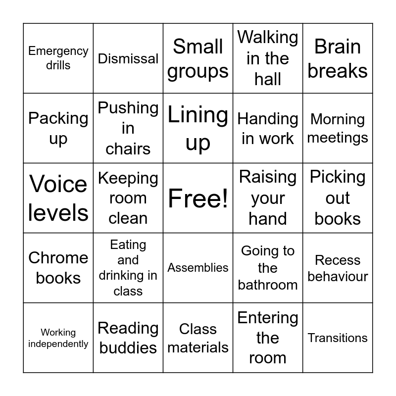 This bingo card has a free space and 24 words: Eating and drinking in class, Reading buddies, Lining up, Working independently, Brain breaks, Emergency drills, Packing up, Dismissal, Raising your hand, Assemblies, Handing in work, Voice levels, Going to the bathroom, Recess behaviour, Pushing in chairs, Entering the room, Picking out books, Small groups, Morning meetings, Keeping room clean, Transitions, Chrome books, Walking in the hall and Class materials.