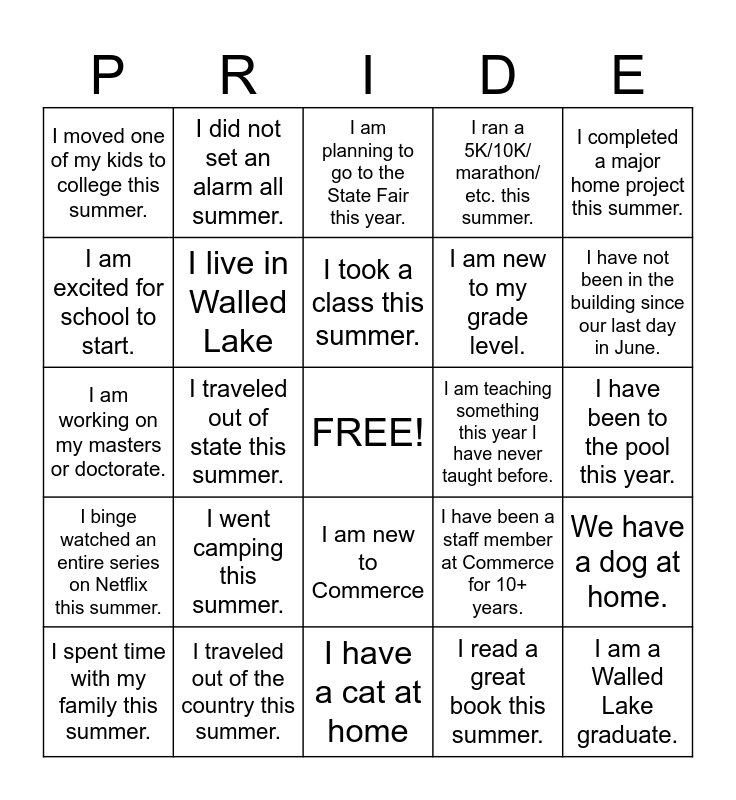 This bingo card has a free space and 24 words: I went camping this summer., I traveled out of the country this summer., I took a class this summer., I spent time with my family this summer., I completed a major home project this summer., I moved one of my kids to college this summer., I am excited for school to start., I did not set an alarm all summer., I am teaching something this year I have never taught before., I am new to Commerce, I am new to my grade level., I am working on my masters or doctorate., I have been a staff member at Commerce for 10+ years., We have a dog at home., I live in Walled Lake, I read a great book this summer., I have been to the pool this year., I am planning to go to the State Fair this year., I have not been in the building since our last day in June., I traveled out of state this summer., I am a Walled Lake graduate., I binge watched an entire series on Netflix this summer., I ran a 5K/10K/ marathon/ etc. this summer. and I have a cat at home.