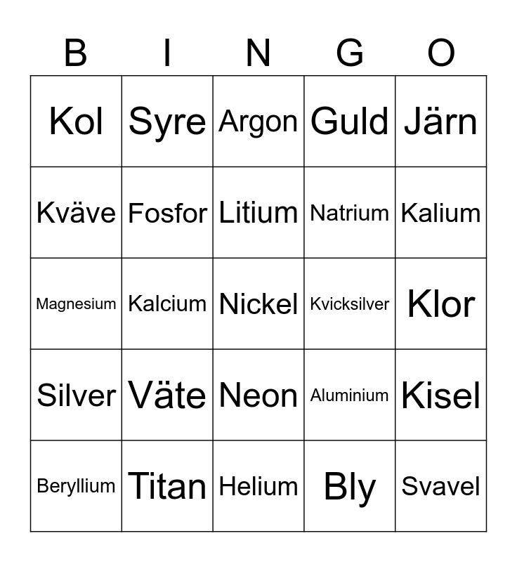 This bingo card has 25 words: Väte, Helium, Litium, Beryllium, Järn, Kol, Kväve, Syre, Kvicksilver, Neon, Natrium, Magnesium, Aluminium, Kisel, Fosfor, Svavel, Klor, Argon, Kalium, Kalcium, Nickel, Titan, Silver, Guld and Bly.