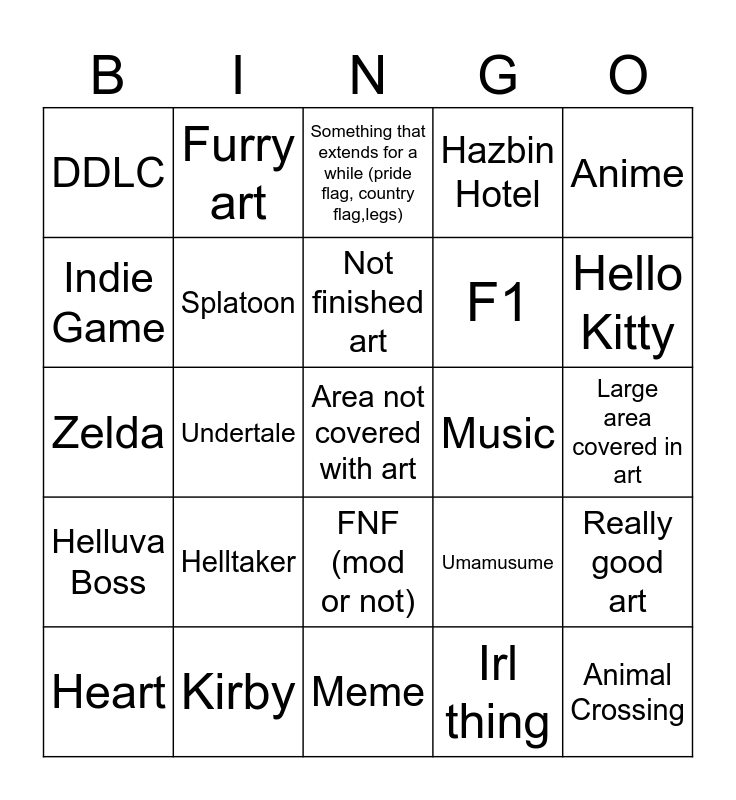 This bingo card has a free space and 65 words: Vocaloid, NSFW, Deltarune, Really good art, Pokemon, BoyKisser, Furry art, Country Flag, Not finished art, Sonic, FNF (mod or not), FNAF, Large area covered in art, Anime, Hollow Knight, Indie Game, Undertale, DDLC, TADC, F1, Helltaker, Helluva Boss, Hazbin Hotel, Pride Flag, Animals, Marvel, Genshin, ZZZ, Animal Crossing, Actual Person, Heart, DC, CSGO, Spongebob, Umamusume, Kirby, Doctor Who, Zelda, Irl thing, Femboy, Splatoon, Vtuber, Music, Minecraft, MHA, Fallout, Hello Kitty, Text, Mario, Religion, DOOM, Metroid, Ace Attorney, Meme, Sabotage, Autism Creature, QR code, Something that extends for a while (pride flag, country flag,legs), void, SCP, Cuphead, Cult of the lamb, slurs, tv show and movies.