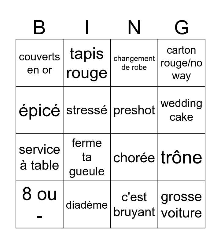 This bingo card has 16 words: diadème, trône, changement de robe, couverts en or, service à table, tapis rouge, chorée, c'est bruyant, épicé, stressé, 8 ou -, carton rouge/no way, ferme ta gueule, wedding cake, preshot and grosse voiture.