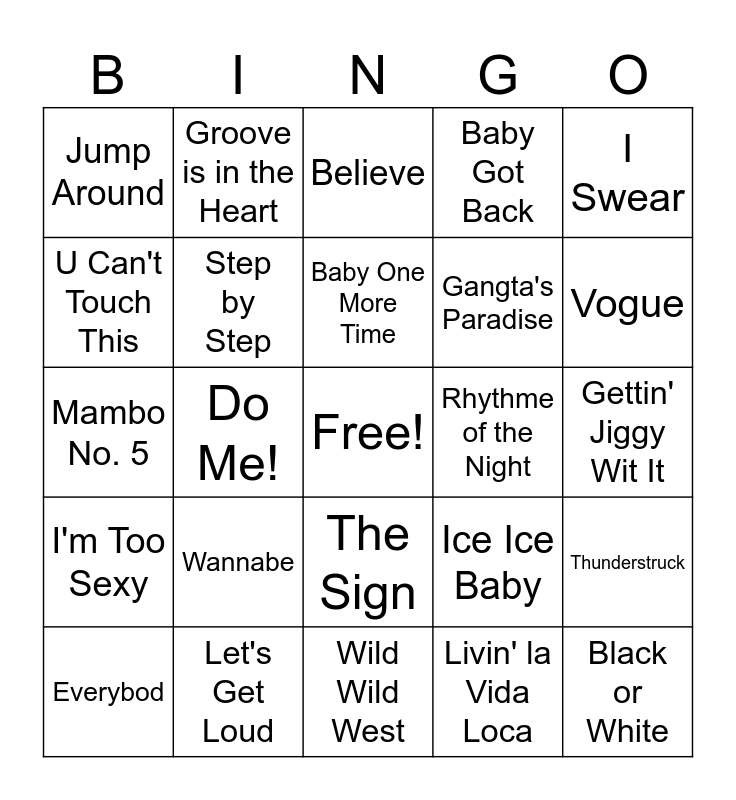 This bingo card has a free space and 24 words: Wannabe, Let's Get Loud, Baby One More Time, Everybod, I Swear, Jump Around, U Can't Touch This, Groove is in the Heart, Rhythme of the Night, The Sign, Gangta's Paradise, Mambo No. 5, Ice Ice Baby, Thunderstruck, Step by Step, Livin' la Vida Loca, Gettin' Jiggy Wit It, Believe, Vogue, Do Me!, Black or White, I'm Too Sexy, Baby Got Back and Wild Wild West.