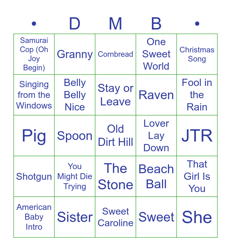 This bingo card has 26 words: The Stone, Sweet, Stay or Leave, Sister, Christmas Song, Samurai Cop (Oh Joy Begin), Singing from the Windows, Granny, JTR, Beach Ball, Raven, Pig, That Girl Is You, American Baby Intro, Spoon, Break Free, One Sweet World, Shotgun, Cornbread, Old Dirt Hill, Fool in the Rain, Sweet Caroline, Lover Lay Down, You Might Die Trying, Belly Belly Nice and She.